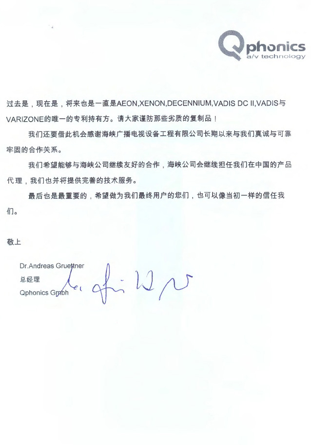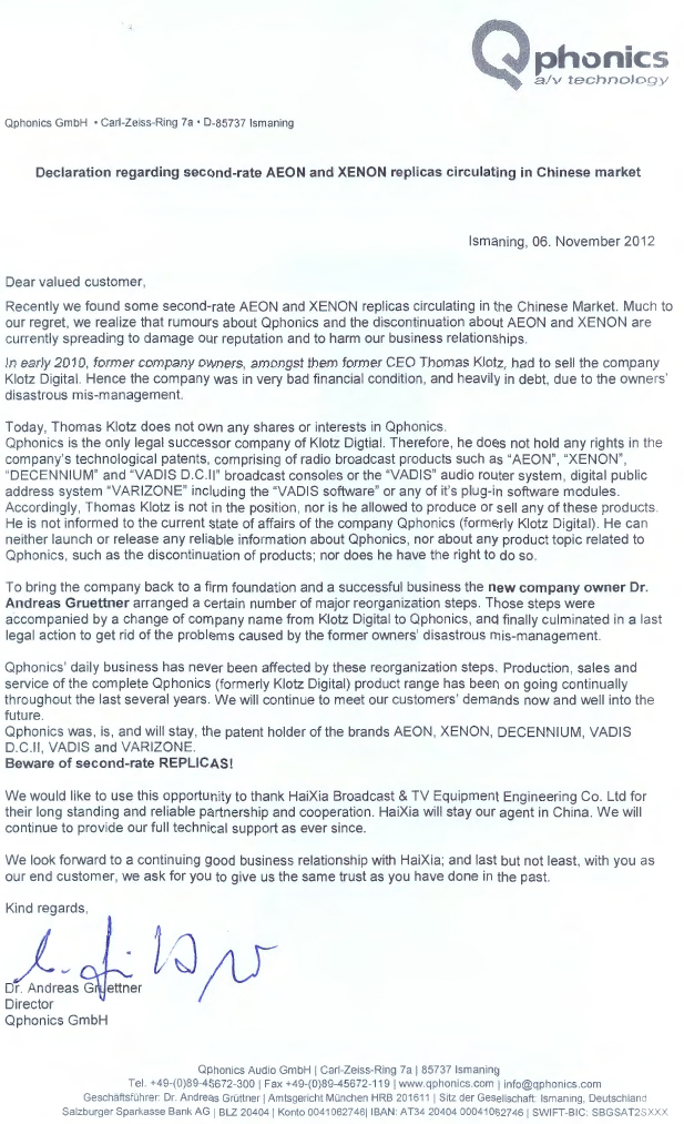 在2010年初,由于當(dāng)時(shí)klotz Digital公司所有者們的管理不善,公司當(dāng)時(shí)財(cái)政狀況非常的差,欠下許多債務(wù)。公司當(dāng)時(shí)的CEO,Thomas Klotz(托馬斯克洛斯),做為公司的所有者的一員,在無(wú)奈之下,不得不賣(mài)掉klotz Digital公司。但是到了今天,Thomas Klotz(托馬斯克洛斯)在Qphonics公司(即之前的Klotz Digital)客戶已不再擁有任何股份。因此Thomas Klotz(托馬斯克洛斯)無(wú)權(quán)使用該公司的任何技術(shù)專利,這些專利包括我們目前的主要廣播設(shè)備產(chǎn)品,如AEON,XENON,DECENNIUM和VADIS D.C.II調(diào)音臺(tái),VADIS的調(diào)音頻路由器系統(tǒng)與VARZONE的擴(kuò)聲系統(tǒng),包括VADIS software軟件和其他即插即用軟件配件。綜上所說(shuō),Thomas Klotz(托馬斯克洛斯)無(wú)資格,也不允許從事產(chǎn)品的生產(chǎn)銷(xiāo)售。同時(shí)Qphonics公司內(nèi)部的情形他更不可能再知道了,再談不上他可以得到任何與Qphonics公司或公司產(chǎn)品有關(guān)的可靠信息。就像他說(shuō)某某產(chǎn)品停產(chǎn)了,他從何得知?他無(wú)權(quán)散布這樣的謠言。