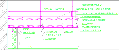 從圖1可以看到,為了防止墻面微小孔隙對隔聲量的影響,通常會在原墻體外增加20mm后的水泥砂漿扇灰,然后留100mm的空腔以增加對聲音低頻部分的吸收。通過把玻璃絲棉固定在橫撐龍骨上,來控制混響時(shí)間的高頻部分。圖2為演播室房頂?shù)穆晫W(xué)結(jié)構(gòu)大樣圖,它分為隔聲層及吸音層兩層,上層通過輕鋼龍骨及次龍骨把隔聲層固定。隔聲層是由超細(xì)玻璃棉及錯(cuò)縫拼接的雙層石膏板構(gòu)成,以隔絕天花以上及空調(diào)的噪聲。它的下層100mm位置,通過噴塑鋼絲網(wǎng)固定50mm厚的玻璃絲棉起到對混響時(shí)間控制的作用。由于通常對演播室防火安全要求為A級,故選用玻璃吸聲棉以及難燃的玻璃纖維布,作為主要的吸聲材料。
