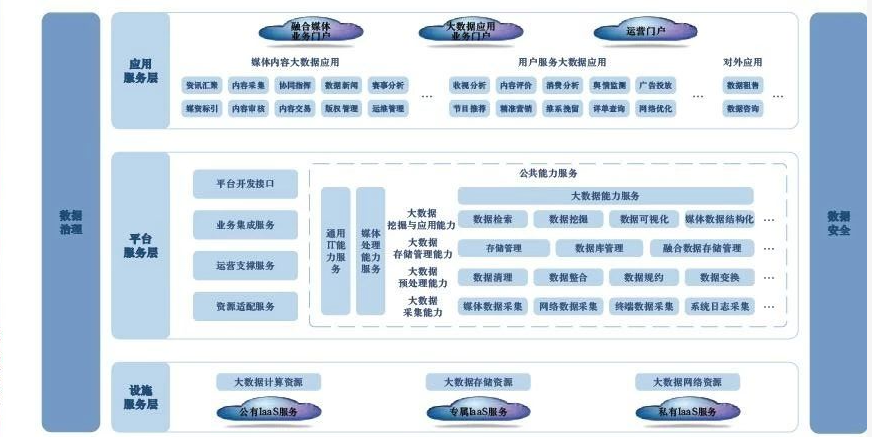 廣電大數(shù)據(jù)的平臺建設,廣電大數(shù)據(jù)的架構要以國標《信息技術 大數(shù)據(jù) 技術參考模型》提出的通用大數(shù)據(jù)參考架構為依據(jù)。在基于媒體融合云平臺建設部署時,要充分利用軟硬件資源,在平臺服務層部署大數(shù)據(jù)的采集、預處理、存儲管理、挖掘與應用等能力,在應用服務層部署媒體內(nèi)容與用戶服務的多種大數(shù)據(jù)應用服務。