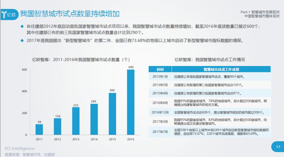 我國智慧城市建設(shè)雖落后于歐美地區(qū),但在政府的支持和企業(yè)的參與下,目前已取得階段性進展:已有95%的副省級城市、83%的地級城市,總計超過500座城市,均明確提出或正在建設(shè)智慧城市。