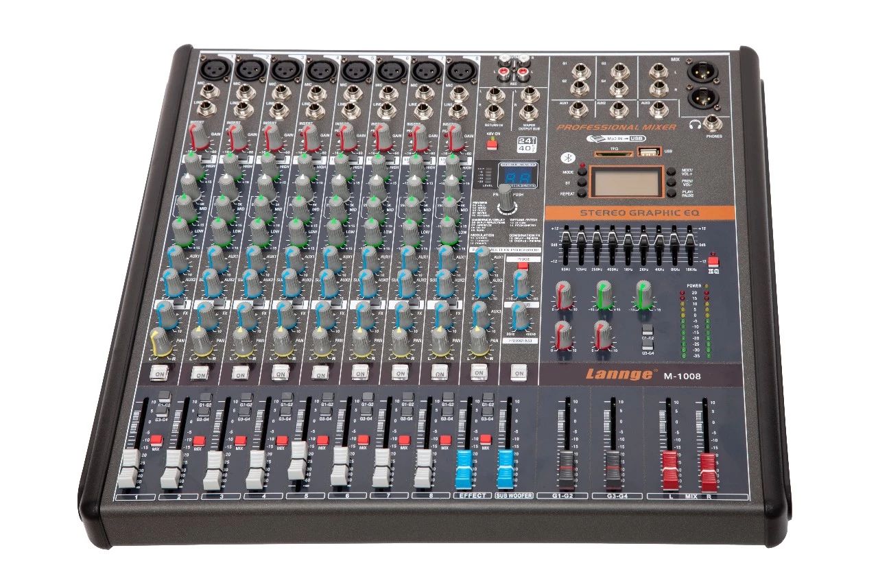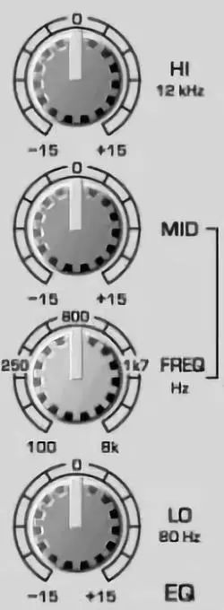 高頻段和低頻段的極限頻率為12千赫茲和80 赫茲。對中頻范圍調音臺有一個半?yún)?shù)型音質調節(jié),適用于100赫茲至8千赫茲之間。用MID調節(jié)按鈕提高/下降音量,用FREQ調節(jié)按鈕調節(jié)頻率。