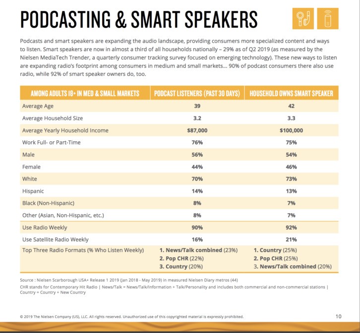 雖然在某些圈子里,農(nóng)村地區(qū)在采用新技術(shù)方面的速度較慢,但尼爾森表示,這些市場(chǎng)內(nèi)的消費(fèi)者是“老練的音頻用戶”,他們還在日常生活中加入了播客和智能音箱。當(dāng)你考慮到新聞/熱心廣播節(jié)目是第二受歡迎的廣播格式時(shí)(在中小市場(chǎng)占11.8%),這些消費(fèi)者對(duì)播客的喜愛也是情理之中的。然而,這些聽眾并沒有放棄廣播。