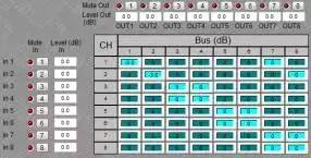 參量型矩陣的節(jié)點(diǎn),除了“on”與“off”的功能外,還可以進(jìn)行對(duì)該節(jié)點(diǎn)的輸出音量值調(diào)整。調(diào)整單位通常為“dB”(分貝)。即可以調(diào)整每個(gè)輸入信號(hào)分配到指定輸出端口的數(shù)值。