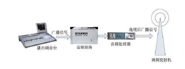 在廣播播出系統(tǒng)主要利用音頻處理器解決音頻信號電平時大時小的問題,使輸出信號的電平保持穩(wěn)定和和解決信號電平的動態(tài)范圍。調頻廣播中音頻處理器的應用,一般接在調音臺播出之后,發(fā)射機前,我臺把音頻處理器串聯(lián)在播出鏈路的最后一級,在調頻發(fā)射機之前。這樣有效地解決了播出系統(tǒng)聲音怱大怱小的問題來獲得最佳音質。如圖3所示。