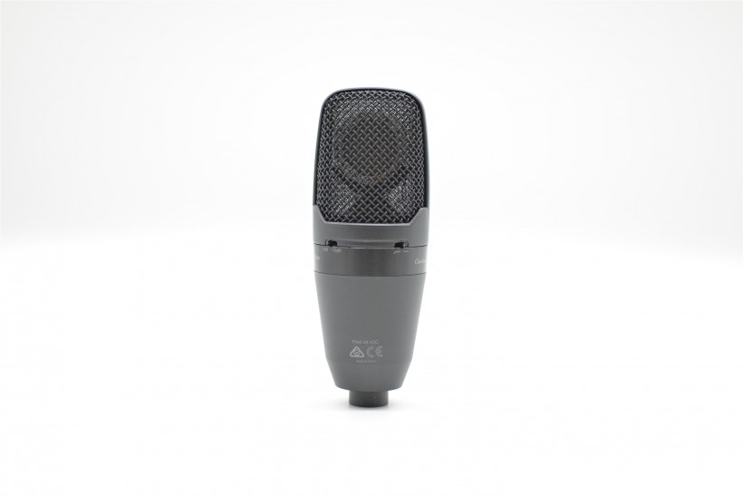話筒的上部為質(zhì)感極佳的金屬網(wǎng)罩,在網(wǎng)罩之中可以看見PGA27的振膜。從網(wǎng)罩中可以看到振膜尺寸還是非常大的,也正因?yàn)榇耍軌蚴惯@個(gè)個(gè)頭并不大的話筒能夠承受不小的聲壓級與更好的動態(tài),帶來具有一定下潛的低頻以及通透的高頻。此外,對于新手玩家的提醒,由于話筒為心型指向,所以正反不要搞錯(cuò),正面為logo位置。