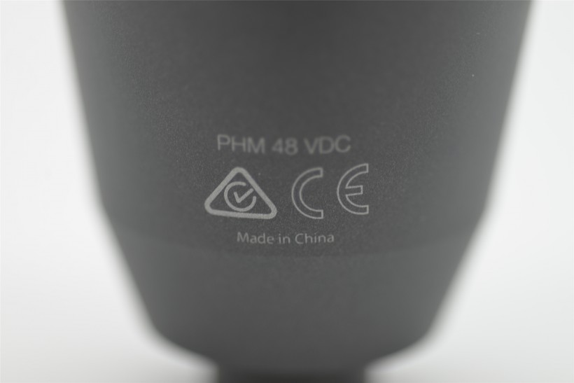 話筒背面的底部位置,寫著PHM 48VDC,就是該話筒需要48V的幻象電源驅(qū)動的意思,下面還有CE認(rèn)證等,再下面印著Made in China一行小字。