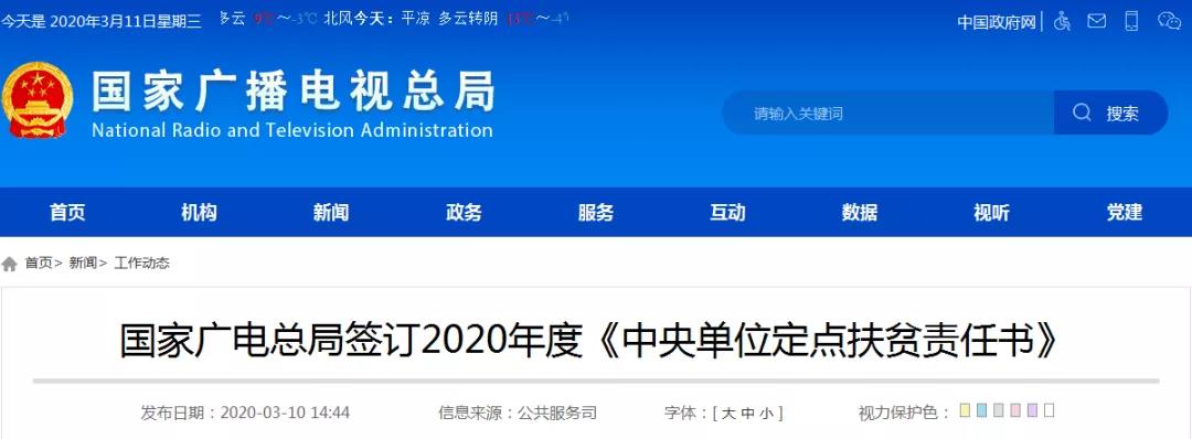 國家廣電總局嚴格落實習(xí)近平總書記關(guān)于扶貧工作“摘帽不摘責(zé)任、摘帽不摘政策,摘帽不摘幫扶、摘帽不摘監(jiān)管”的重要指示精神,保持幫扶力度,鞏固脫貧成果,研究簽訂了2020年度《中央單位定點扶貧責(zé)任書》。