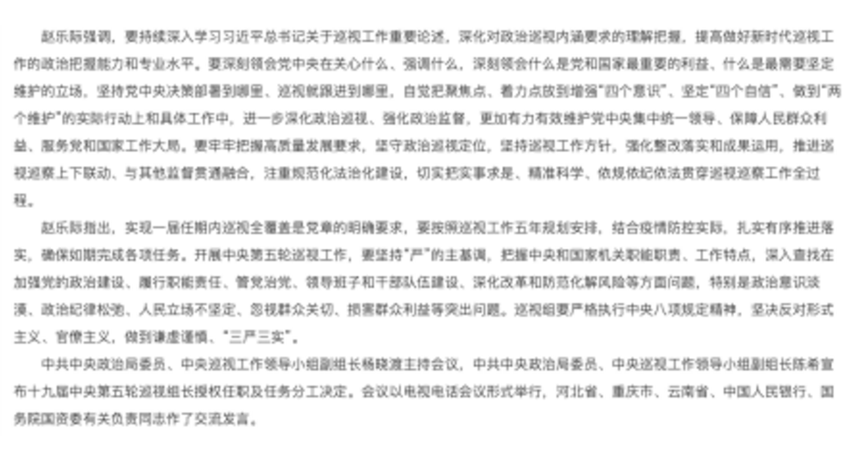 2020年5月10日趙樂際出席全國巡視工作會(huì)議暨十九屆中央第五輪巡視動(dòng)員部署會(huì),新聞通稿如下,大家仔細(xì)看看。