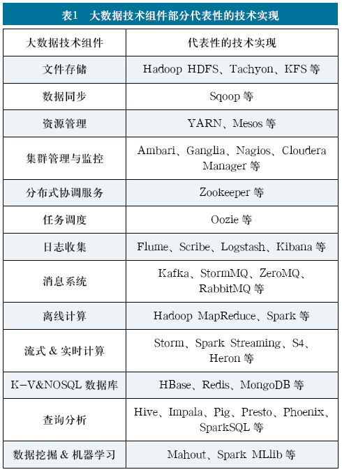 在大數(shù)據(jù)能力中心的構(gòu)建過程中,應(yīng)依托大數(shù)據(jù)技術(shù)組件、標準和算法等關(guān)鍵要素,形成一套縱向可挖掘、橫向可擴展的大數(shù)據(jù)技術(shù)體系架構(gòu),為智慧廣電頂層應(yīng)用打牢技術(shù)基礎(chǔ)。智慧廣電的相關(guān)技術(shù)體系包括人工智能技術(shù)、大數(shù)據(jù)技術(shù)、音視頻技術(shù)、云計算技術(shù)等。其中,大數(shù)據(jù)技術(shù)一方面基于新一代智能廣電網(wǎng)絡(luò)采集多源異構(gòu)的用戶行為數(shù)據(jù),另一方面為智慧廣電頂層應(yīng)用提供數(shù)據(jù)分析、數(shù)據(jù)挖掘等技術(shù)支撐,同時為人工智能技術(shù)體系提供海量訓(xùn)練數(shù)據(jù),是智慧廣電技術(shù)體系的重要一環(huán)。目前,大數(shù)據(jù)技術(shù)體系已經(jīng)趨于成熟,其關(guān)鍵的技術(shù)組件主要包括大數(shù)據(jù)的文件存儲、數(shù)據(jù)同步、資源管理、集群管理與監(jiān)控、分布式協(xié)調(diào)服務(wù)、任務(wù)調(diào)度、日志收集、消息系統(tǒng)、離線計算、流式&實時計算、K-V&NOSQL數(shù)據(jù)庫、查詢分析、數(shù)據(jù)挖掘&機器學(xué)習(xí)等等,各個技術(shù)組件代表性的技術(shù)實現(xiàn)[4][5]等如表1所示。這些技術(shù)組件涵蓋了大數(shù)據(jù)采集、存儲、清洗、分析、處理,挖掘等全流程各個環(huán)節(jié),是大數(shù)據(jù)支撐頂層業(yè)務(wù)應(yīng)用的必要基礎(chǔ)。