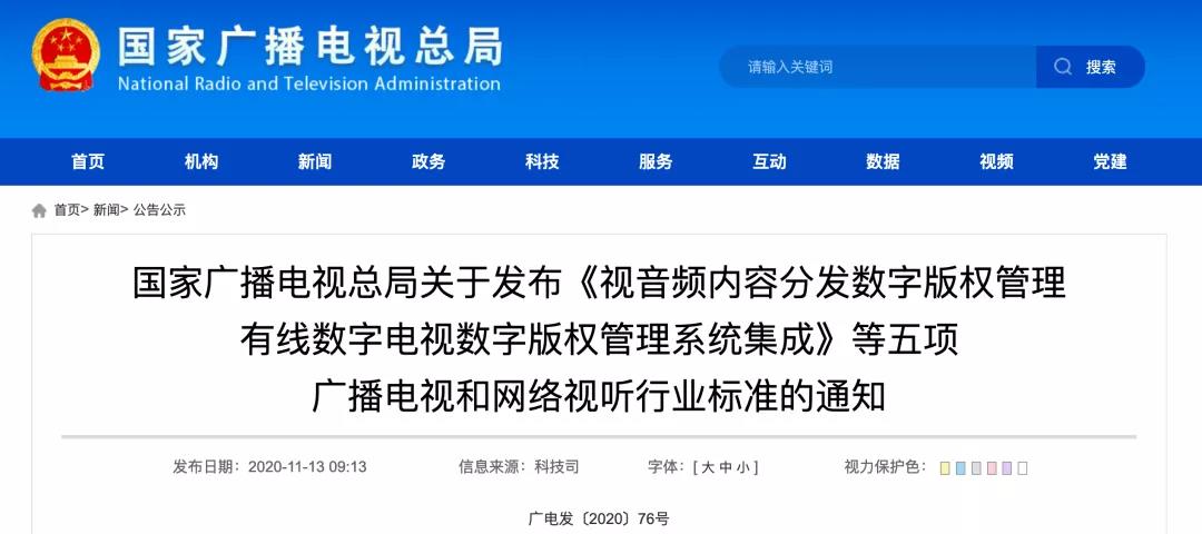 國(guó)家廣播電視總局組織審查了《視音頻內(nèi)容分發(fā)數(shù)字版權(quán)管理 有線數(shù)字電視數(shù)字版權(quán)管理系統(tǒng)集成》《視音頻內(nèi)容分發(fā)數(shù)字版權(quán)管理 IPTV 數(shù)字版權(quán)管理系統(tǒng)集成》等五項(xiàng)標(biāo)準(zhǔn)文件,現(xiàn)批準(zhǔn)為中華人民共和國(guó)廣播電視和網(wǎng)絡(luò)視聽推薦性行業(yè)標(biāo)準(zhǔn),予以發(fā)布。
