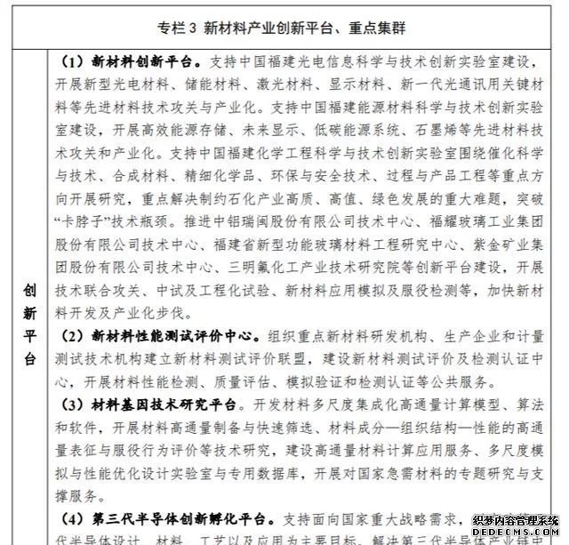 電子信息材料。圍繞集成電路、新型顯示、第三代半導(dǎo)體領(lǐng)域需求,突破一批高端產(chǎn)品生產(chǎn)技術(shù),填補(bǔ)國(guó)內(nèi)空白。圍繞半導(dǎo)體產(chǎn)業(yè)配套需求,發(fā)展光刻膠、高純?cè)噭?、電子氣體、封裝材料等電子專用化學(xué)品。依托中國(guó)科學(xué)院福建物質(zhì)結(jié)構(gòu)研究所,鞏固提升激光晶體、磁光晶體、半導(dǎo)體發(fā)光材料等光電子材料技術(shù)優(yōu)勢(shì)。依托省內(nèi)龍頭企業(yè),發(fā)展以氮化鎵、碳化硅、鈣鈦礦為代表的第三代半導(dǎo)體材料。依托將樂(lè)軍民融合第三代半導(dǎo)體晶體研究中心等創(chuàng)新平臺(tái),研發(fā)、生產(chǎn)第三代寬禁帶半導(dǎo)體晶體材料。