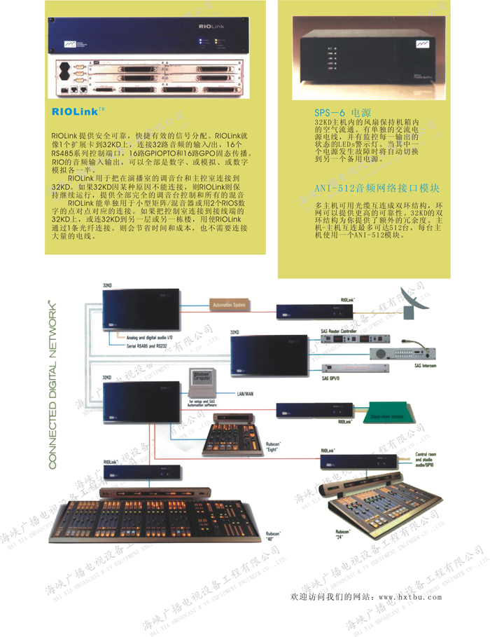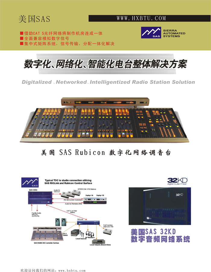 操作簡便 ,靈活,直觀,功能強(qiáng)大的RUBICON有簡潔的操控界面。通過SAS全數(shù)字連接網(wǎng)絡(luò),可連接其他SAS RUBICON調(diào)音臺,SAS對講系統(tǒng),以及SAS32KD矩陣,組成內(nèi)部網(wǎng)絡(luò)系統(tǒng);它還可直接操控與系統(tǒng)連接的其他有關(guān)設(shè)備。它的幾大重要特色:輸入模塊可將信號直接輸送到PGM1、PGM2、REC及UTILITY立體聲母線上;通過任選件Console control moudule,調(diào)音臺輸入模塊操作模式可作記憶及隨時呼喚使用,具備密碼鎖定功能;有8、16、24、32、40個模塊的各種結(jié)構(gòu)供選。