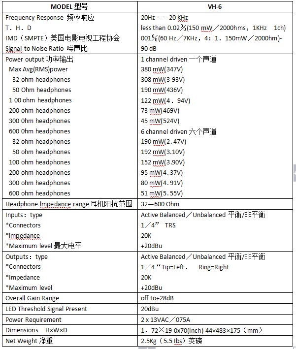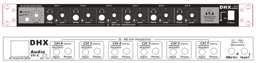 B. VH-6的功率輸出是有限的。連接太多的耳機,每個耳機獲得的功率將減少并使VH-6超負荷。接入10-12個低阻抗的耳機VH-6將不堪重負。為減少VH-6的功率流失,并聯(lián)使用時請使用高阻抗(100歐姆或更大)的耳機。參考DHX的提示“了解耳機功率要求”(從經(jīng)銷商或廠家購買)中的耳機和響應(yīng)電平。