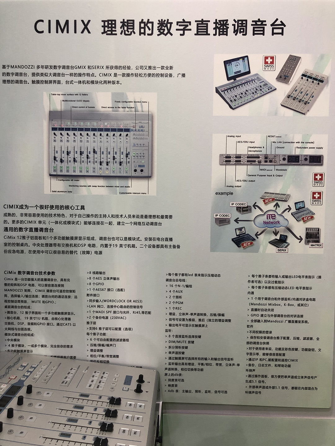 基于MANDOZZI 多年研發(fā)數(shù)字調(diào)音臺(tái)GMIX 和SERIX 所獲得的經(jīng)驗(yàn),公司又推出一款全新的數(shù)字調(diào)音臺(tái),提供類似大調(diào)音臺(tái)一樣的操作特點(diǎn)。CIMIX 是一款操作輕松方便的控制設(shè)備,廣播理想的調(diào)音臺(tái)。觸摸控制屏界面,臺(tái)式一體機(jī)和模塊化兩種版本。