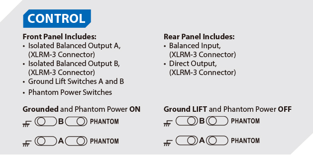 分配器設(shè)有三組輸出 - 1 組直接輸出、2 組變壓器隔離輸出,每組輸出端均可同時為話筒連接幻象供電工作。而 2 組變壓器隔離輸出 (A及B) 同樣設(shè)有地線連接開關(guān),可幫助解決因地線回路產(chǎn)生的噪音。將開關(guān)推向右時,地線會設(shè)于分離狀態(tài);將開關(guān)推向左時,地線會設(shè)定為連接。另外 A 及 B 輸出均設(shè)有幻象供電開關(guān),可個別控制不同調(diào)音臺到話筒的幻象供電安排。