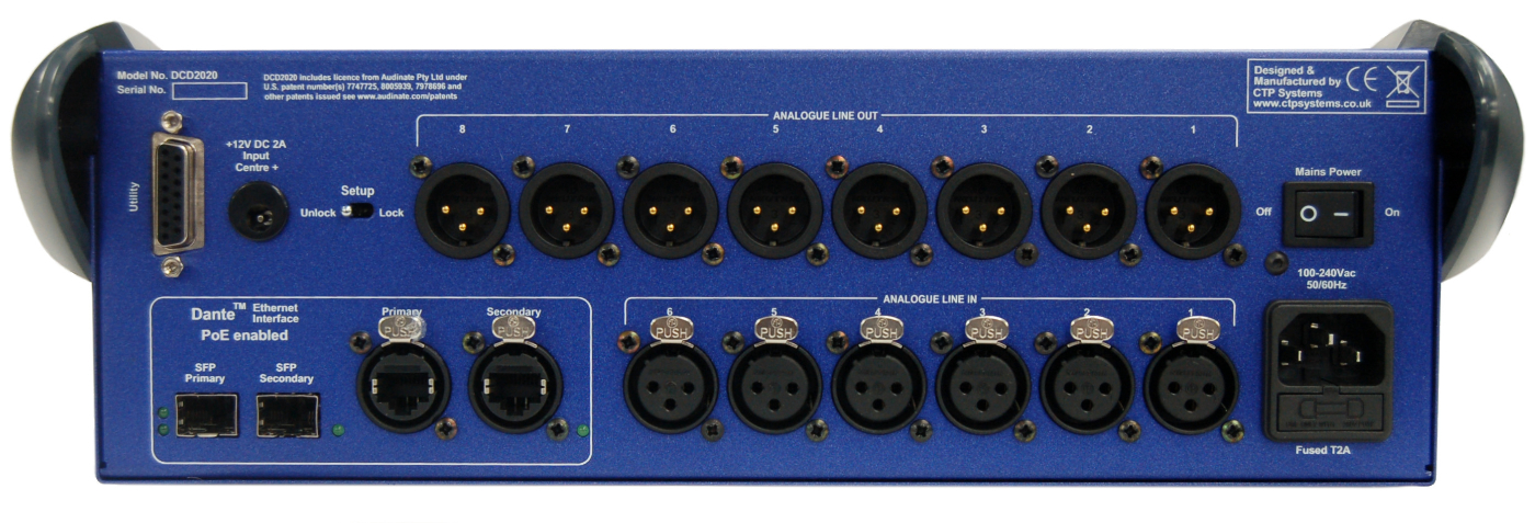 通過設(shè)備背面的XLR可提供6個(gè)模擬輸入和8個(gè)模擬輸出,所有這些都可通過網(wǎng)絡(luò)訪問。 這些突破沒有固定功能,可根據(jù)需要用于外部設(shè)施。 它們還可用于向/從評(píng)論框提供模擬輸入和輸出。 例如,如果評(píng)論員A模擬格式本地需要麥克風(fēng),只需在Dante控制器上選擇Prog Out Com A交叉點(diǎn)到模擬線路輸出1。 使用模擬突破可以將DCD2020用作基本上模擬的單元,但是它仍然需要某種形式的網(wǎng)絡(luò)連接。
